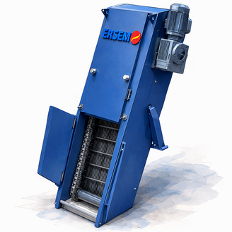 The rake bars capture debris and move it upward against the direction of water flow, followed by discharge into a container or a screw conveyor. The process is continuous and does not affect the hydraulic capacity of the channel.